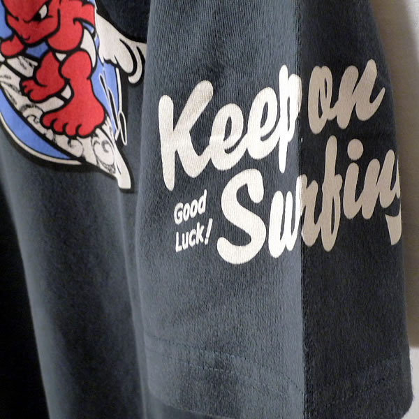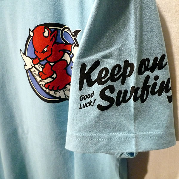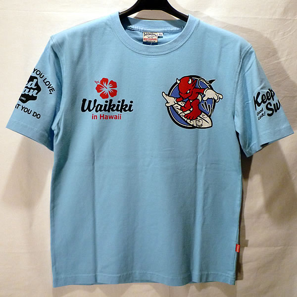 サーフィンデビルとハイビスカスの半袖Tシャツ。