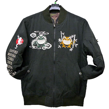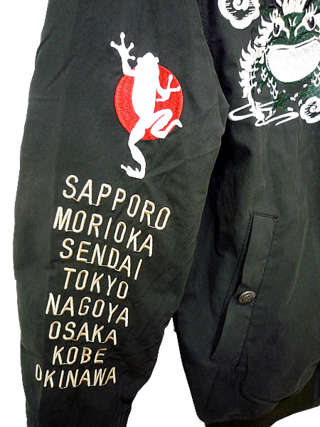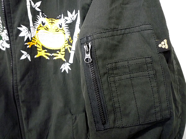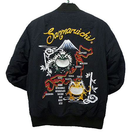 その1のリバーシブル・ブルゾンのカエル刺繍入りバージョンの和柄スカジャン。フロント、バックともに参丸一お得意のカエル刺繍入り。さらに袖にも・・・